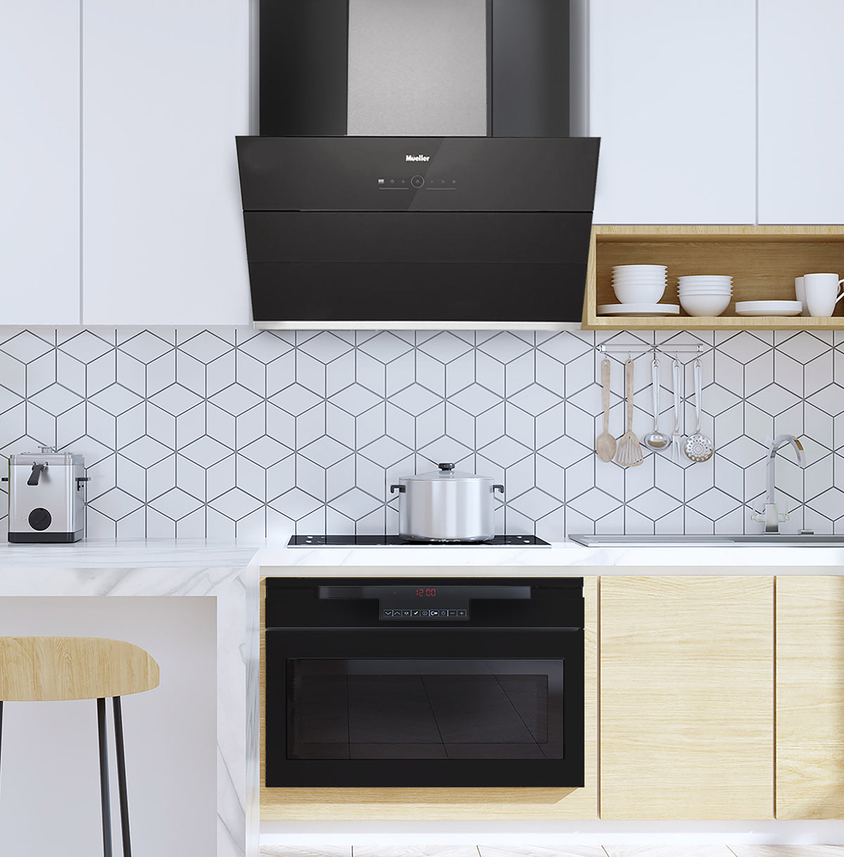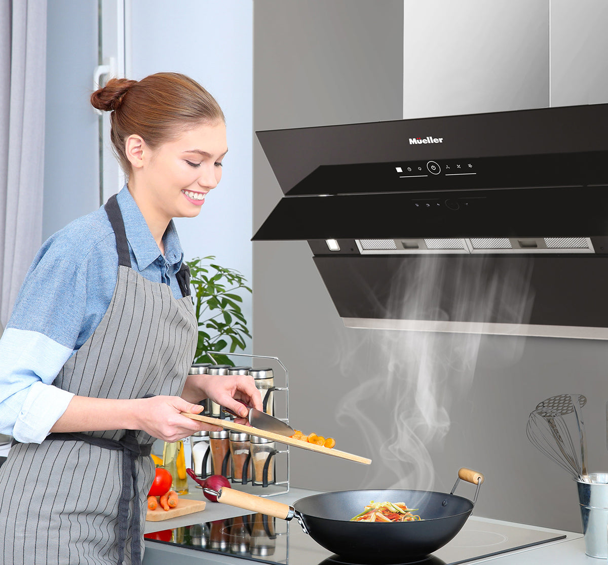 Elevate your kitchen with this showpiece 36 inch deluxe Range Hood by Mueller. The stainless steel wall mount range hood is the essence of European styling with the sleek black tempered glass paneling that opens up during operation. Behind the high-end design lies an incredibly powerful motor that delivers 900CFM efficiency to combat steam, smoke, and unwanted odors quickly – all at low noise levels! With ducted operation and triple-layer aluminum grease filters, your cooking conditions will be optimized instantly. Features a streamlined touch control interface for easy setting adjustment, as well as energy-saving LED lights that keep the cooking surface illuminated. Easy to clean with removable grease collector and easy-access filters.