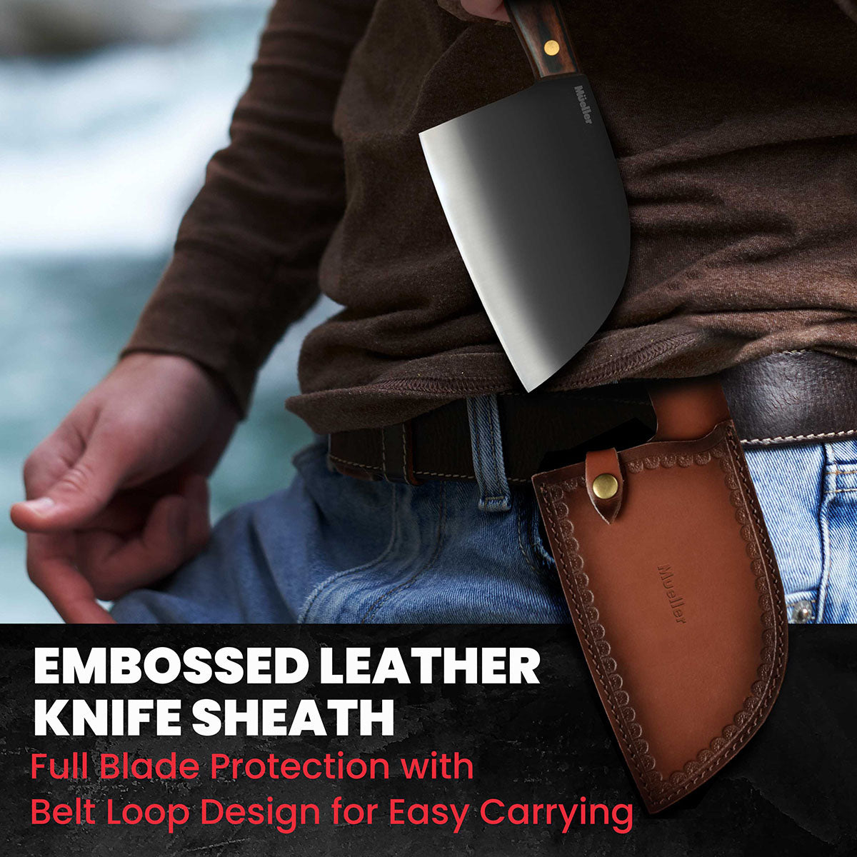 Experience unmatched precision with the Mueller UltraForged Serbian Meat Cleaver Knife, featuring a 6.7-inch high-carbon steel blade that effortlessly handles meat, vegetables, and more. Hand-forged with a full-tang design and a durable pakkawood handle, this cleaver offers exceptional balance and control for both kitchen and outdoor use. Complete with a premium leather sheath, it's the ideal choice for chefs and home cooks seeking a versatile, heavy-duty butcher knife.