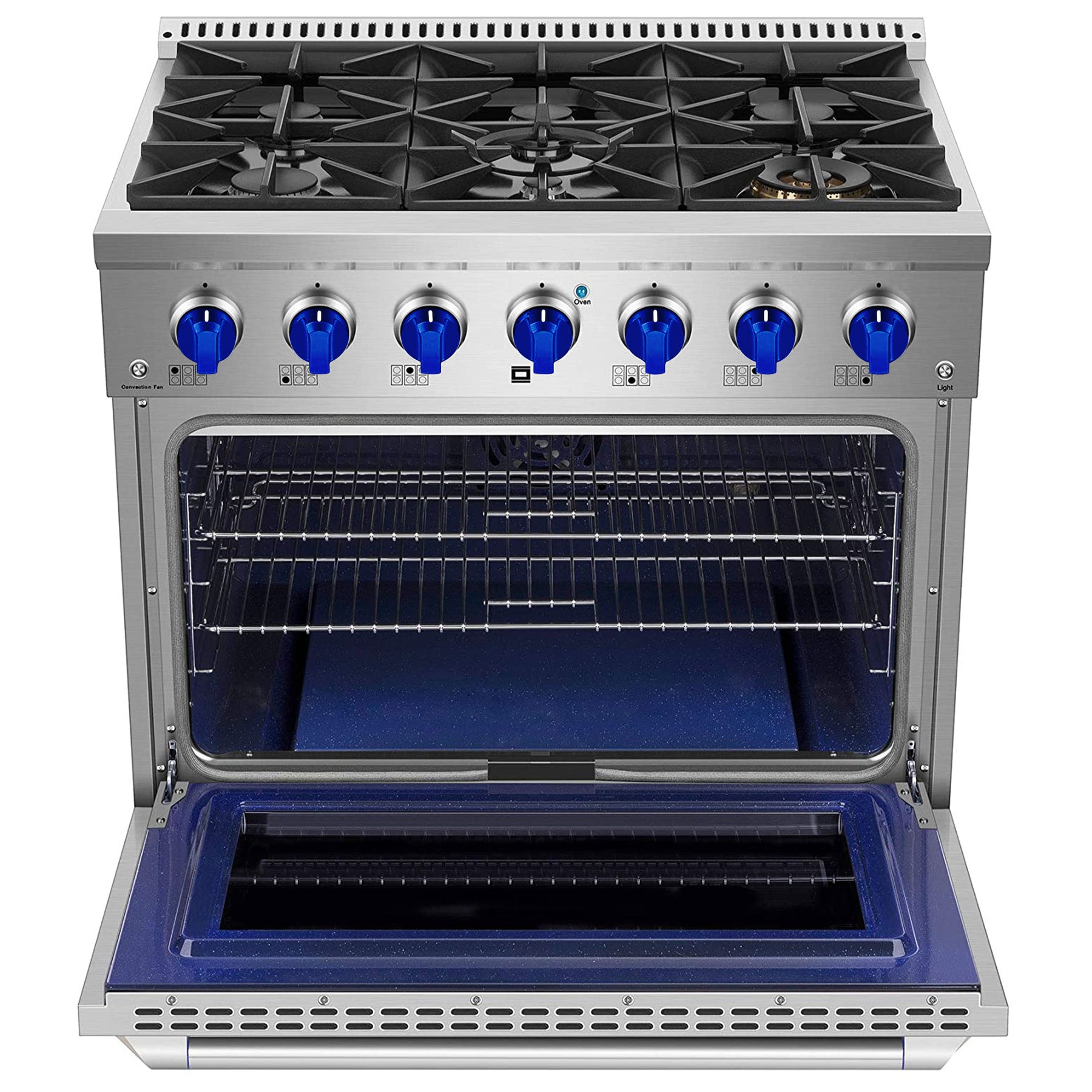 Enjoy the timeless design and performance of the Mueller 36 in. Freestanding Gas Range. The Professional Series Range provides superior heating and precise control so you can enjoy the satisfaction of dishes cooked to perfection. Features 6 high-powered, Italian-made sealed gas burners for optimal performance. Includes a brass double burner that allows you to cook at intense heat for boiling, stir frying, or searing, or turn down to a gentle simmer when cooking the most delicate of sauces. The Mueller Range also boasts an extra-large capacity oven so you can easily bake for a crowd. The convenient convection functionality provides even heat distribution to help deliver tenderness and crispness to your dishes. At Mueller, our team has designed and engineered this robust range with the end-user in mind, utilizing only premium materials with elegant blue features for that distinctive professional style to complement any kitchen.