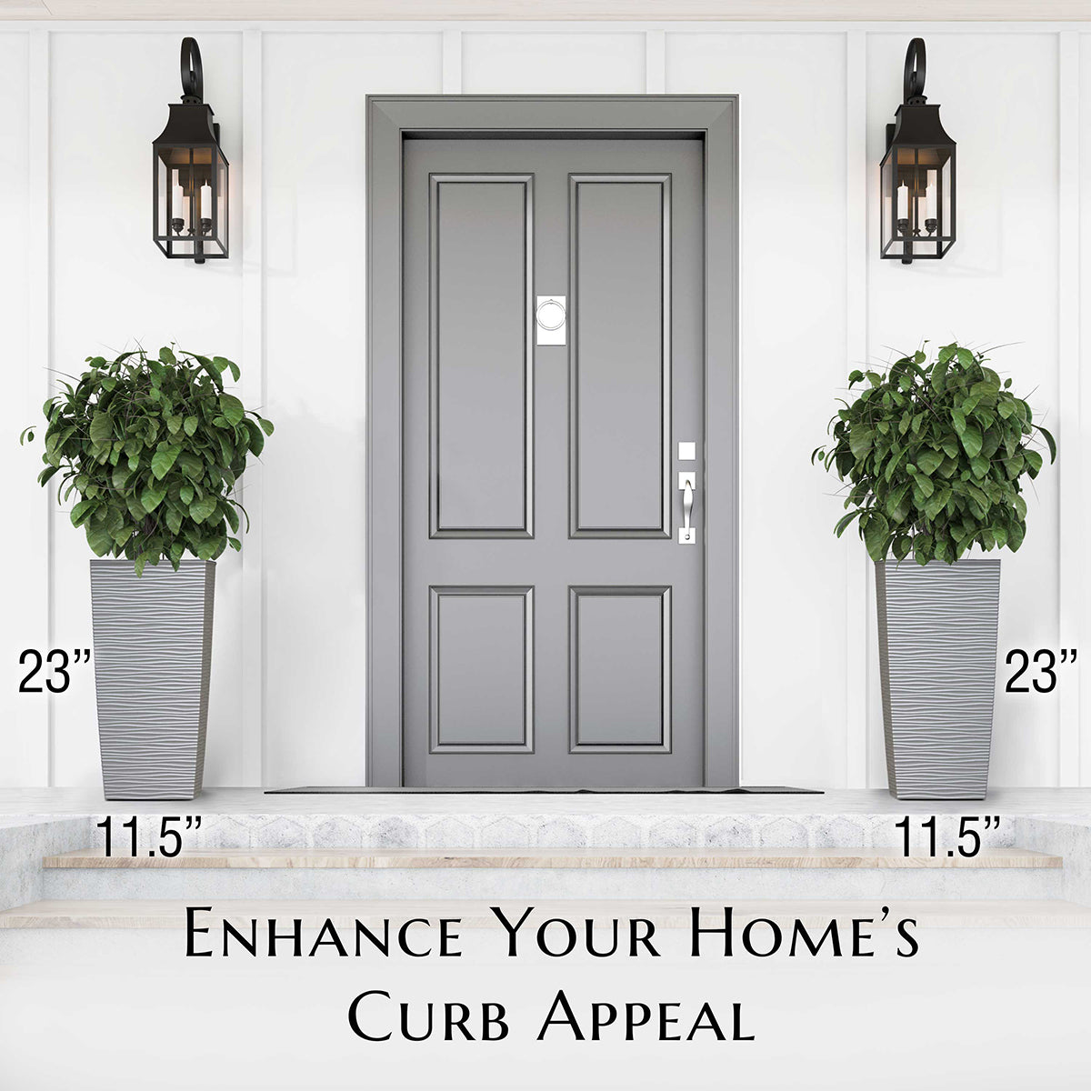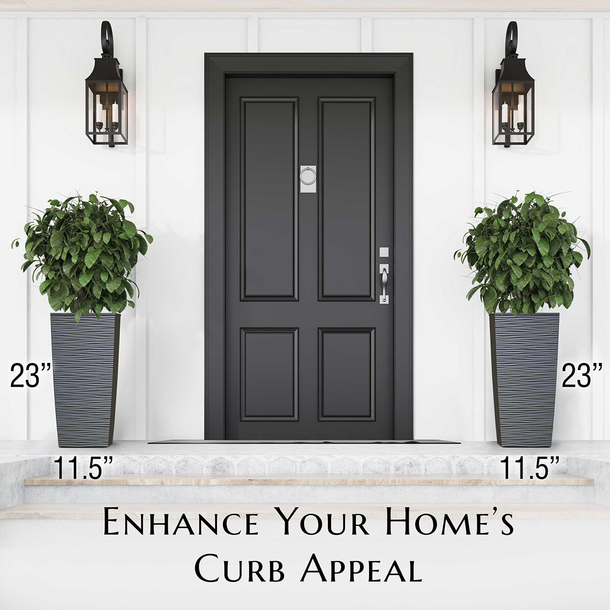 Black front door with planters on either side on a white wall background. Showing the size of the planters.