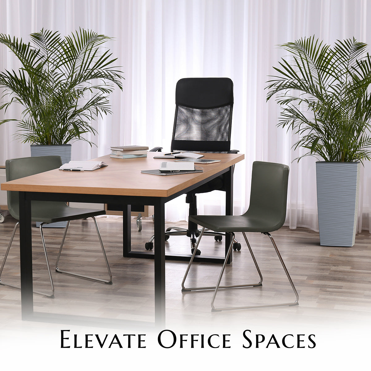 Modern office setup with a table, chairs, and plants potted in Mueller Planters in a bright room.